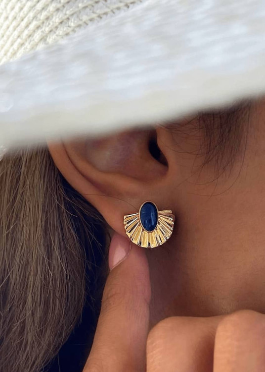 این گوشواره زنانه بادبزنی با طراحی خاص و تلفیق طلای ۱۸ عیار و سنگ تیره، جلوهای منحصربهفرد به استایل شما میبخشد.